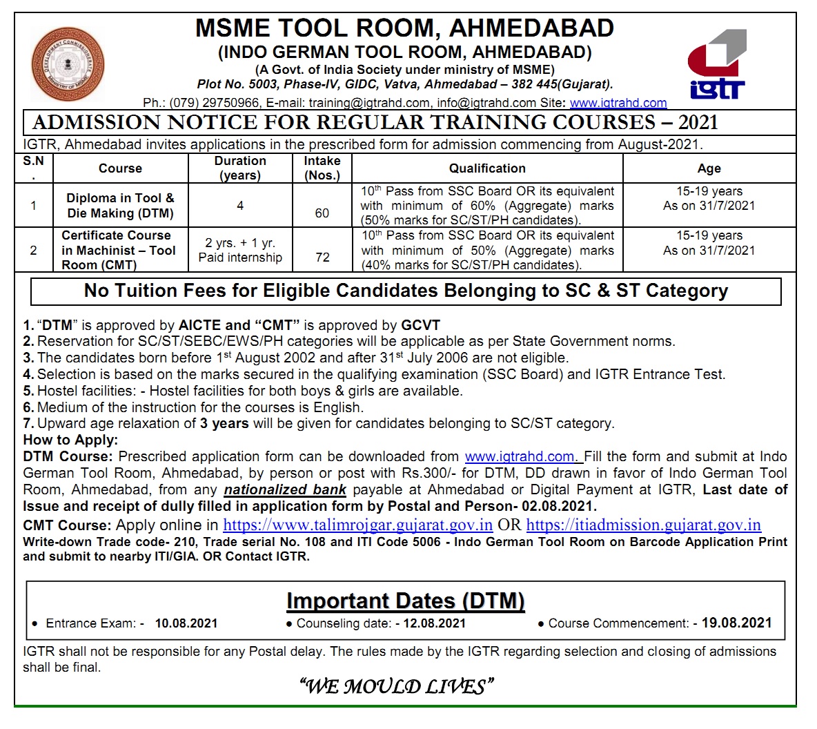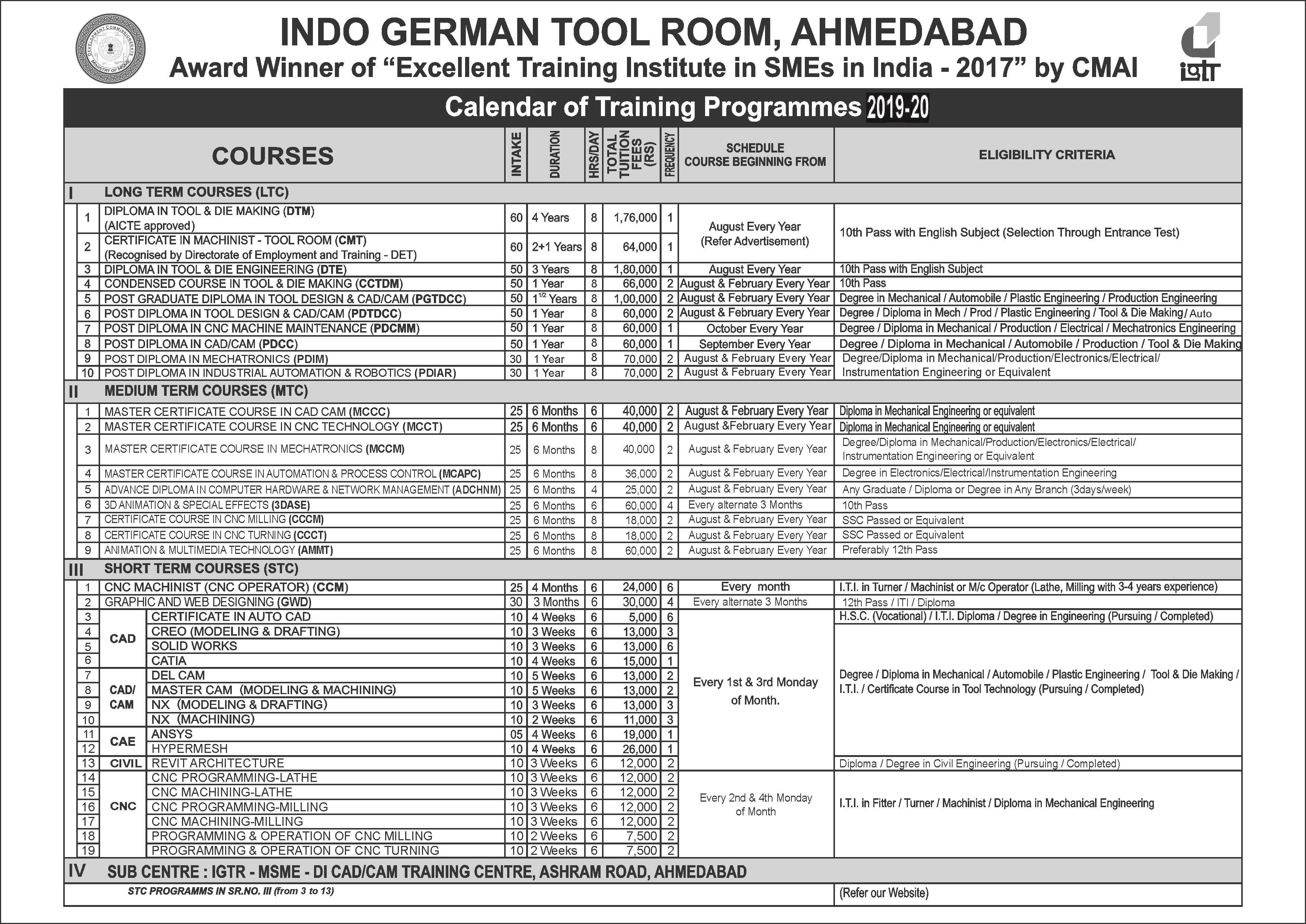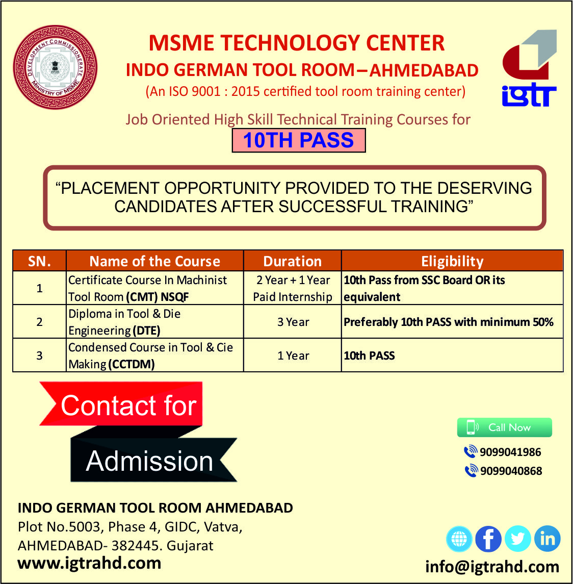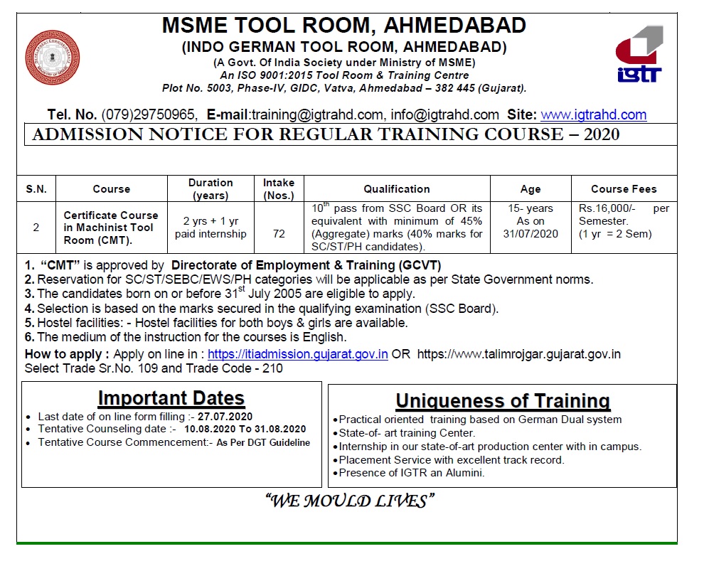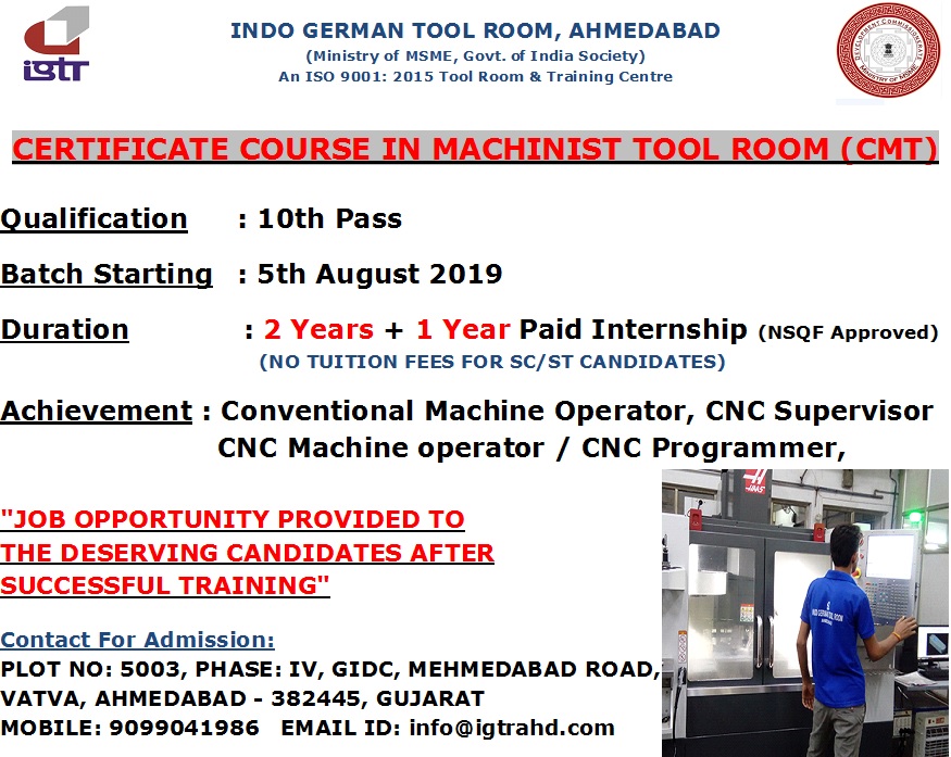 Advertise for Certificate Course in Machinist Tool Room (CMT)