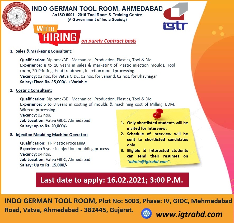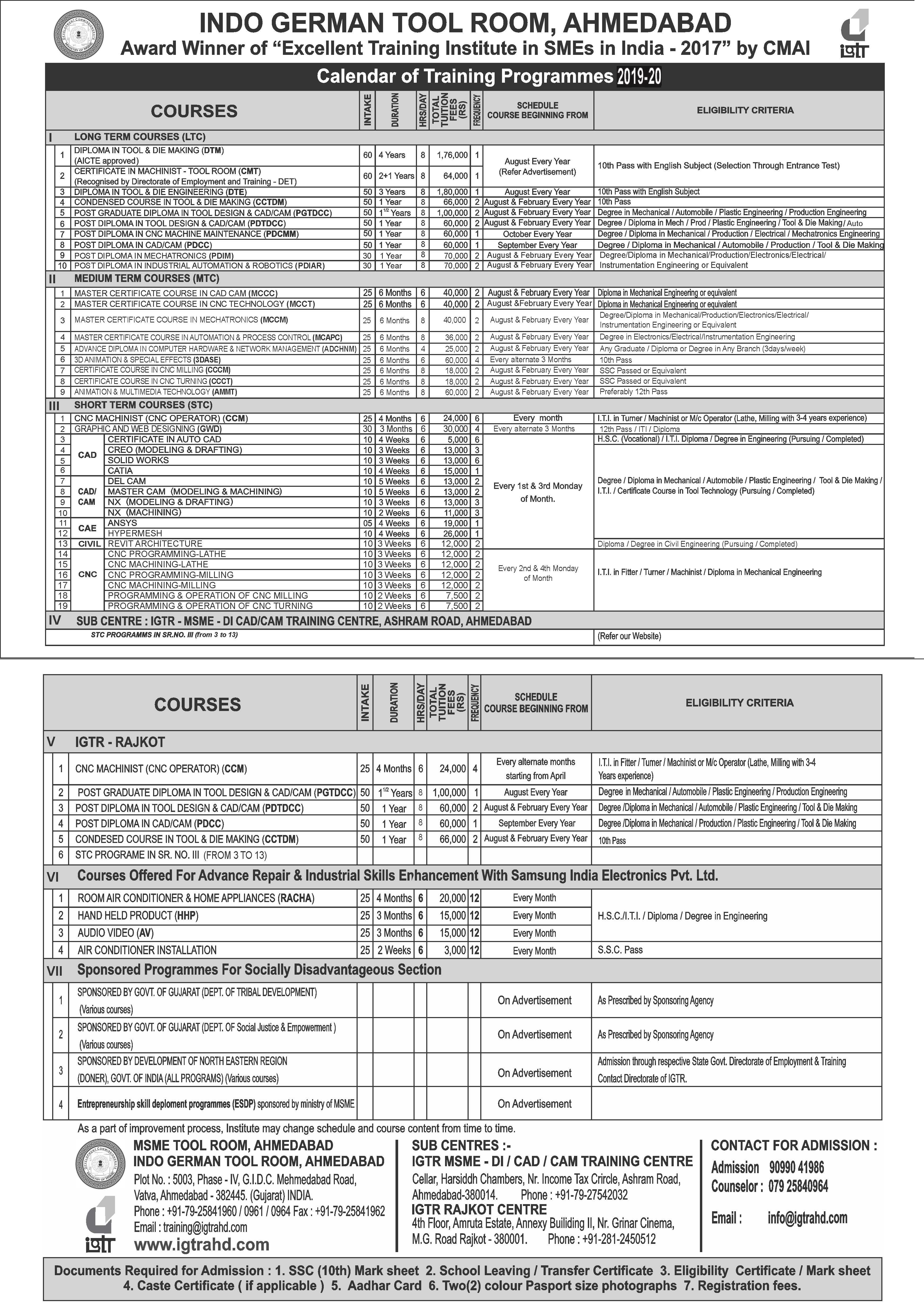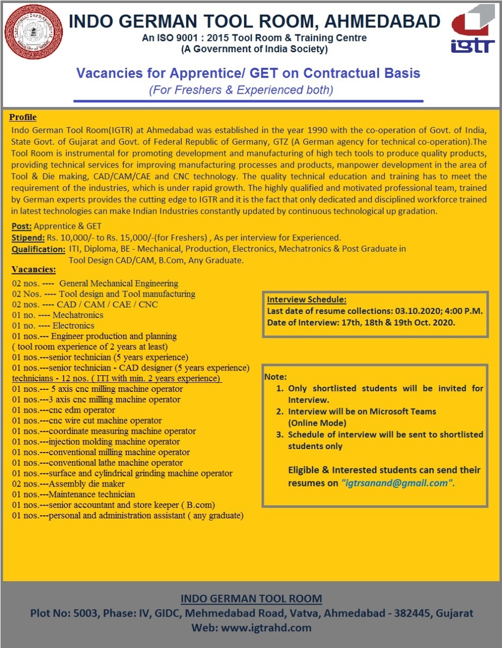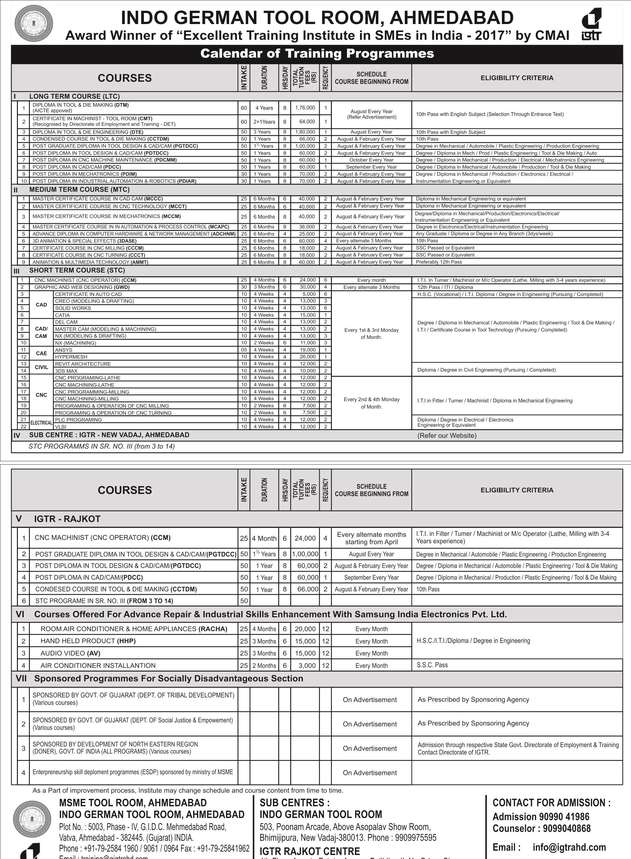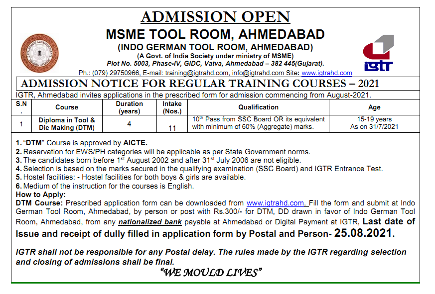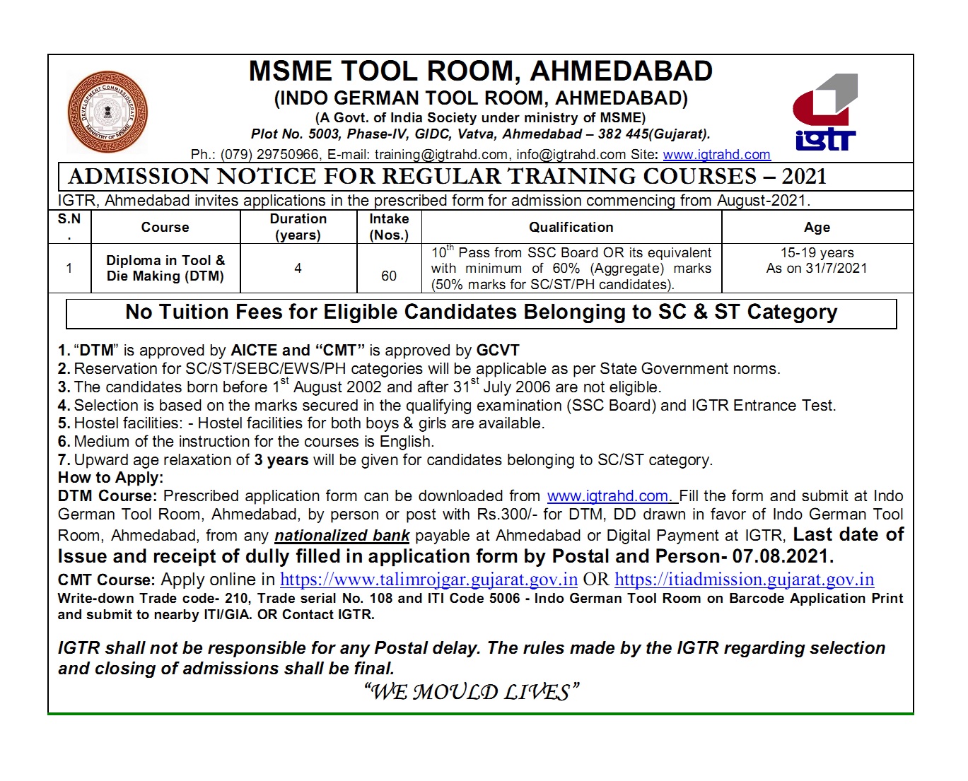 Advertise for Certificate Course in Machinist Tool Room (CMT)